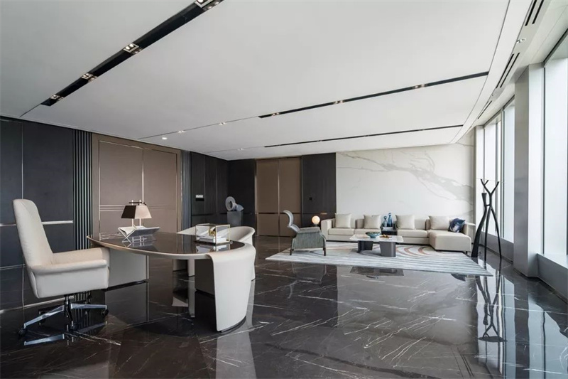 對于辦公室吊頂的設計理念,往往設計為部分層疊吊頂和部分吊頂吊頂。這種造型設計方法是將部分管線、工程建筑梁或照明燈做成造型吊頂,而保留其他部分的原工程建筑吊頂多用于樓層較低但相對規整的工程建筑梁的室內空間,因為對布線管線進行合理有效的裝飾后,仍能最大限度地利用原工程建筑的高度。這種吊頂造型不僅要注意造型吊頂與原工程建筑吊頂的和諧關系,還要注意吊頂、地面與建筑立面的關系。