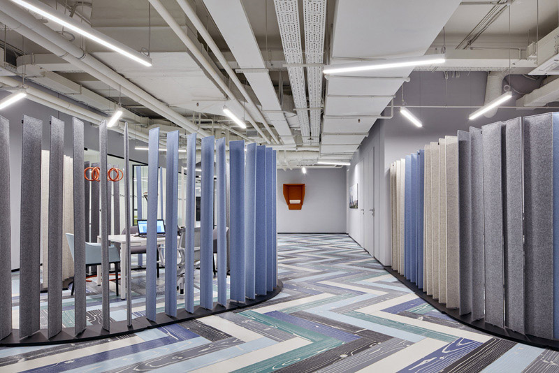 空間業態的規劃會產生很大的影響。創建一個緩沖區可以減輕這種不幸的影響。可以用展示柜或者收納柜來緩沖,可以緩解空間不通暢的尷尬局面,也可以讓實用性更高,收納空間更大,辦公室看起來更簡潔。